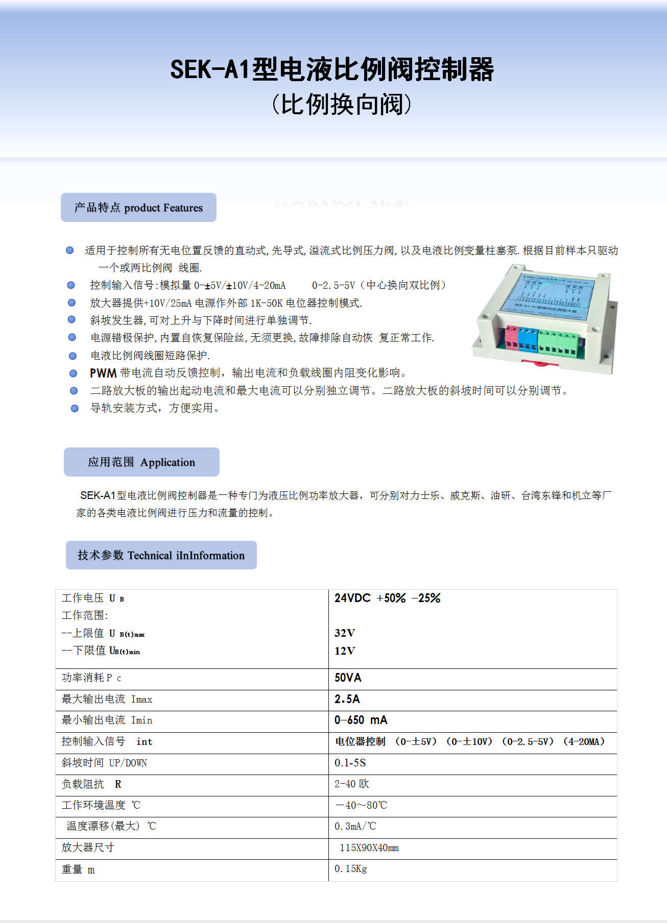 适用于控制所有无电位置反馈的直动式,先导式,溢流式比例压力阀,以及电液比例变量柱塞泵.根据目前样本只驱动